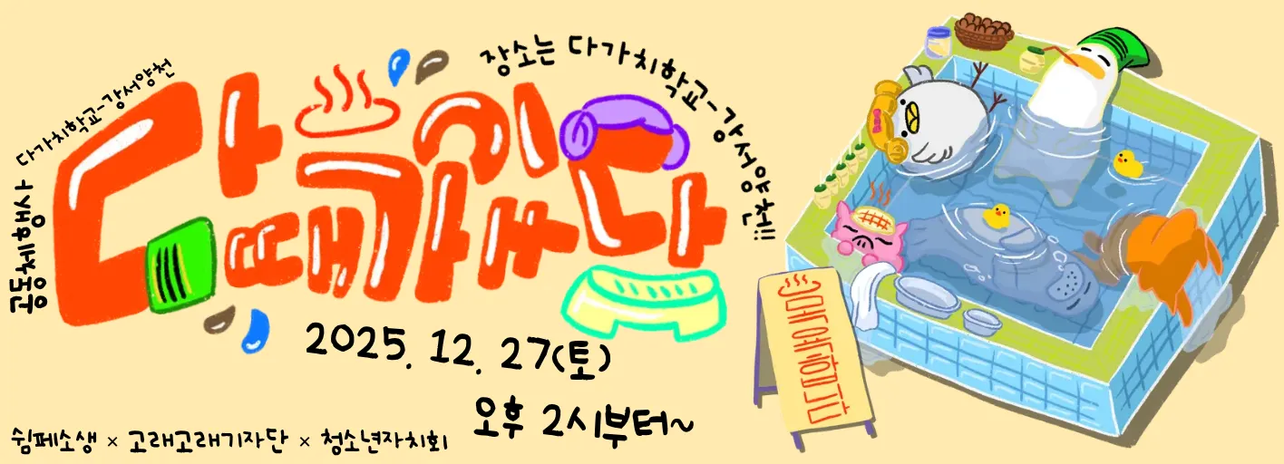 행사 안내 일 시 : 2025년 12월 27일(토) 14:00~ 장 소 : 다가치학교-강서양천 대 상 : 다가치학교와 신나게 즐기고 싶은 청소년 누구나!(프로젝트 신청을 하지 않아도 참여 가능합니다.) 준비물 : 텀블러, 목욕바구니(바구니만 필요해요!)